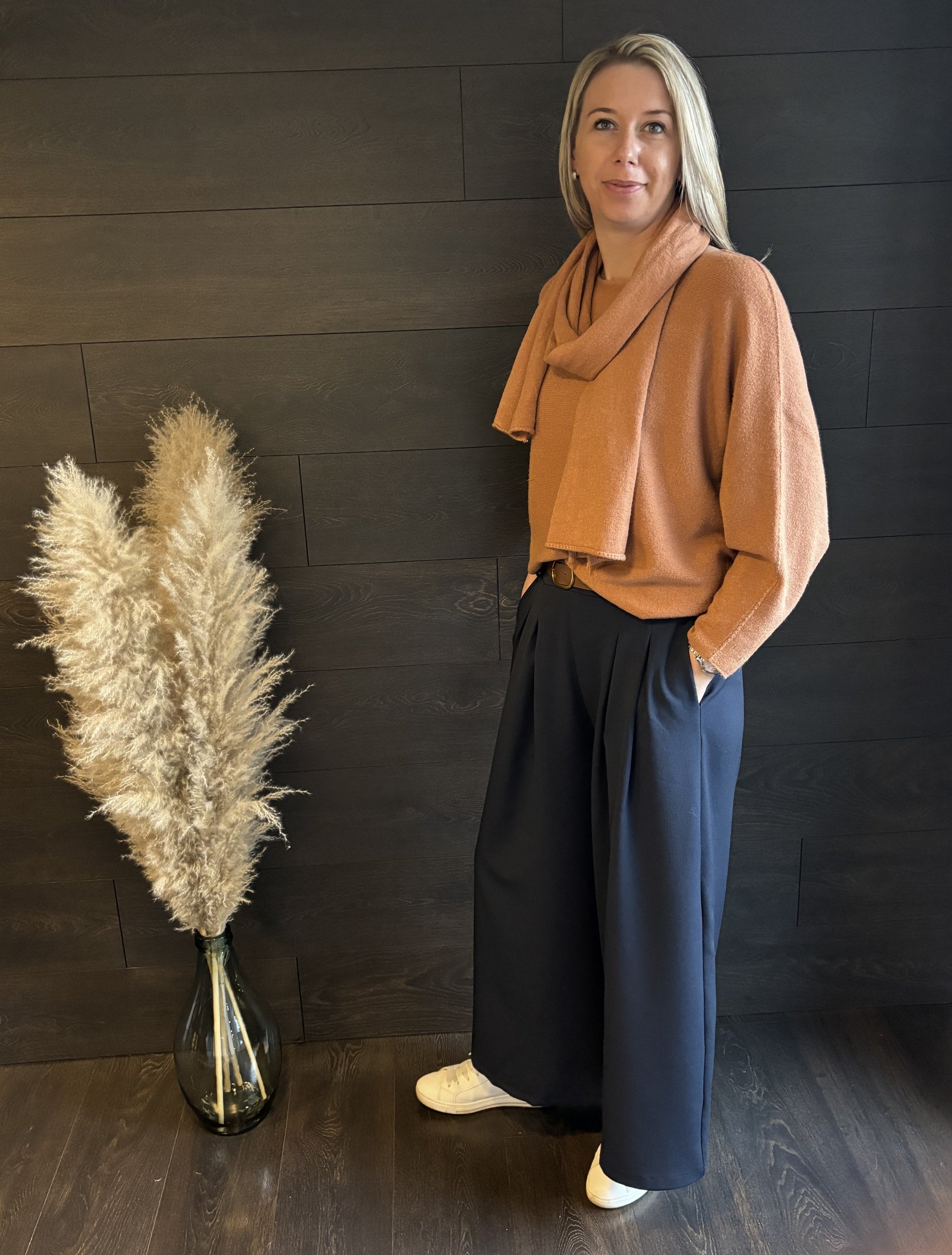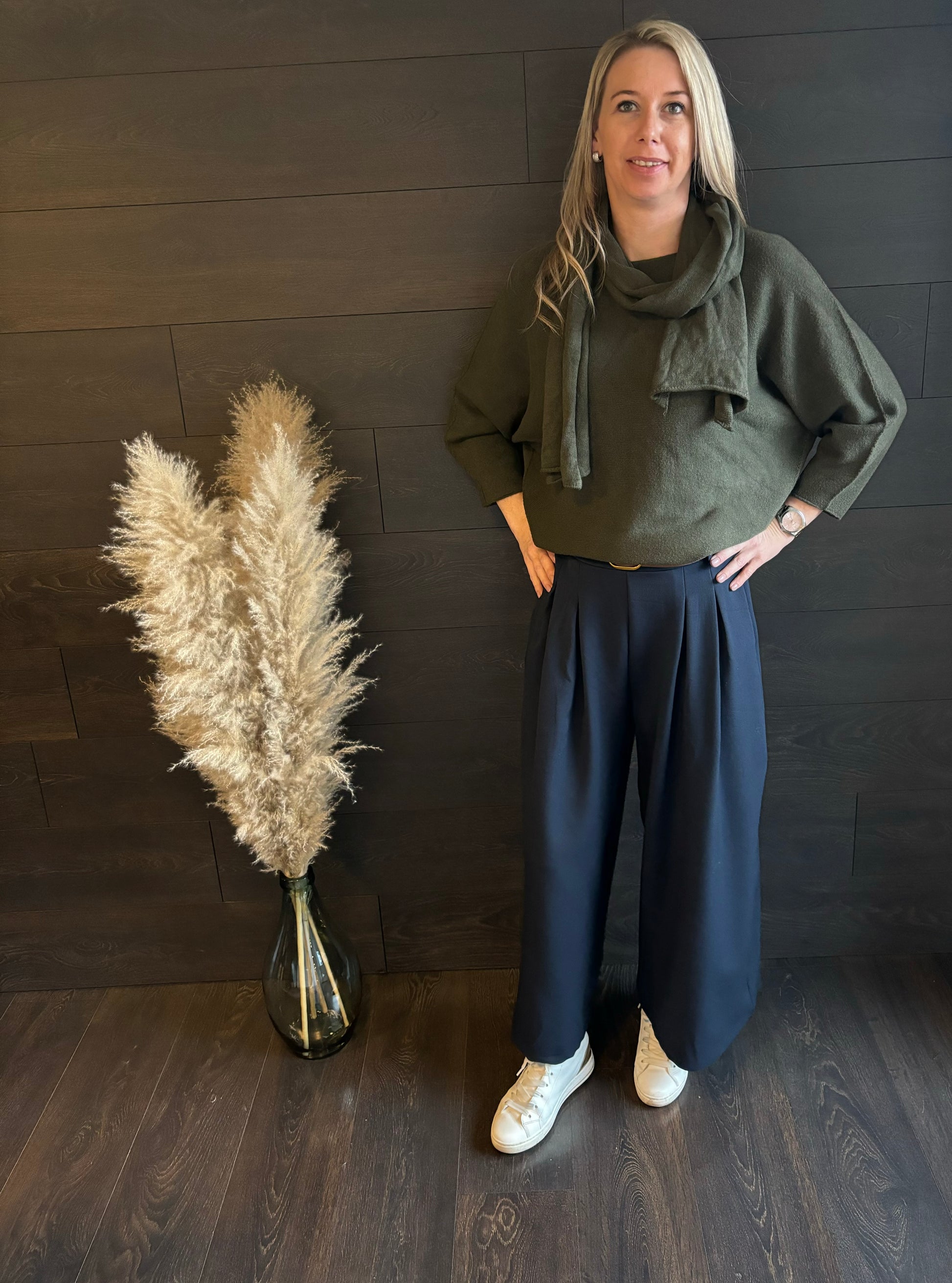 Deze blauwe geklede broek met mooie afwerking van zakken en plooien. Kan je met veel combineren, inclusief met riem. Het is een 7/8 model van broek (ik ben 1M72) Prijs kwaliteit een zeer goed.