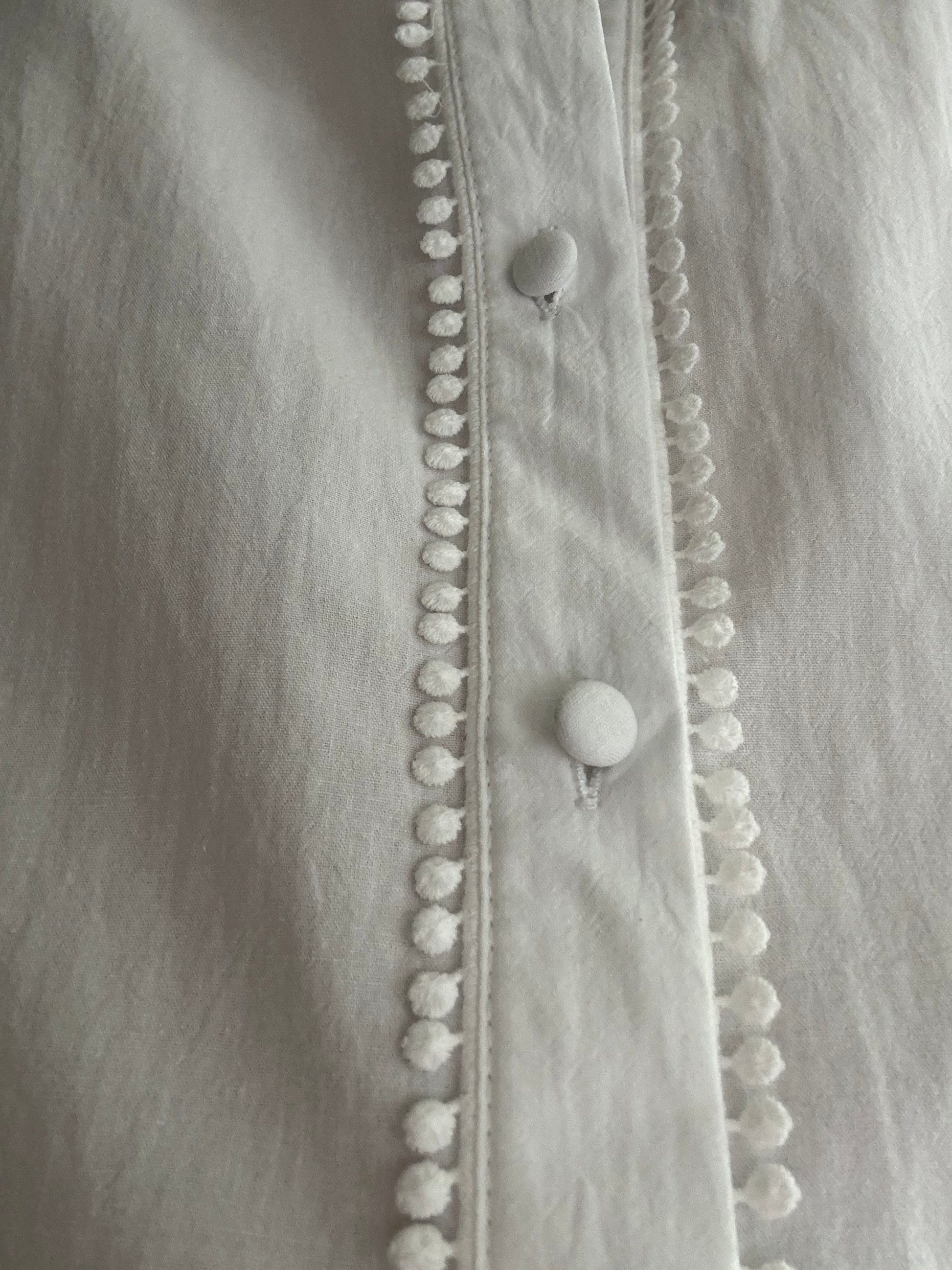 De blouse tailleert klein, is niet gecentreerd zou zeker maar voorstellen deze tot maat M. Is vervaardigd uit 100% katoen.