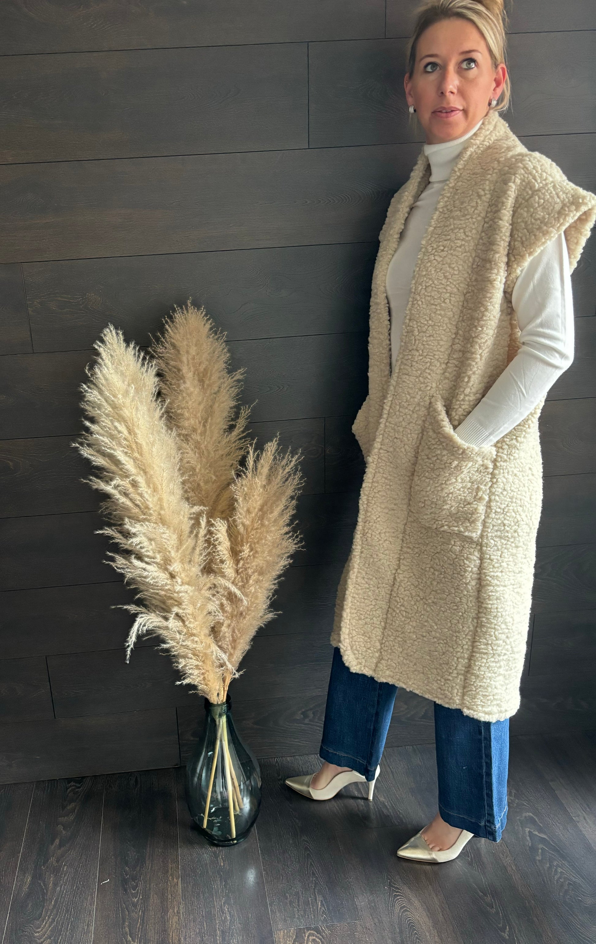 Deze super toffe teddy bodywarmer is een echt unieke afwerking van uw ensemble. deze heb ik enkel in ecru kleur en TU deze kan van XS tot maat L gedragen worden, is een lang model met steekzakken vooraan.