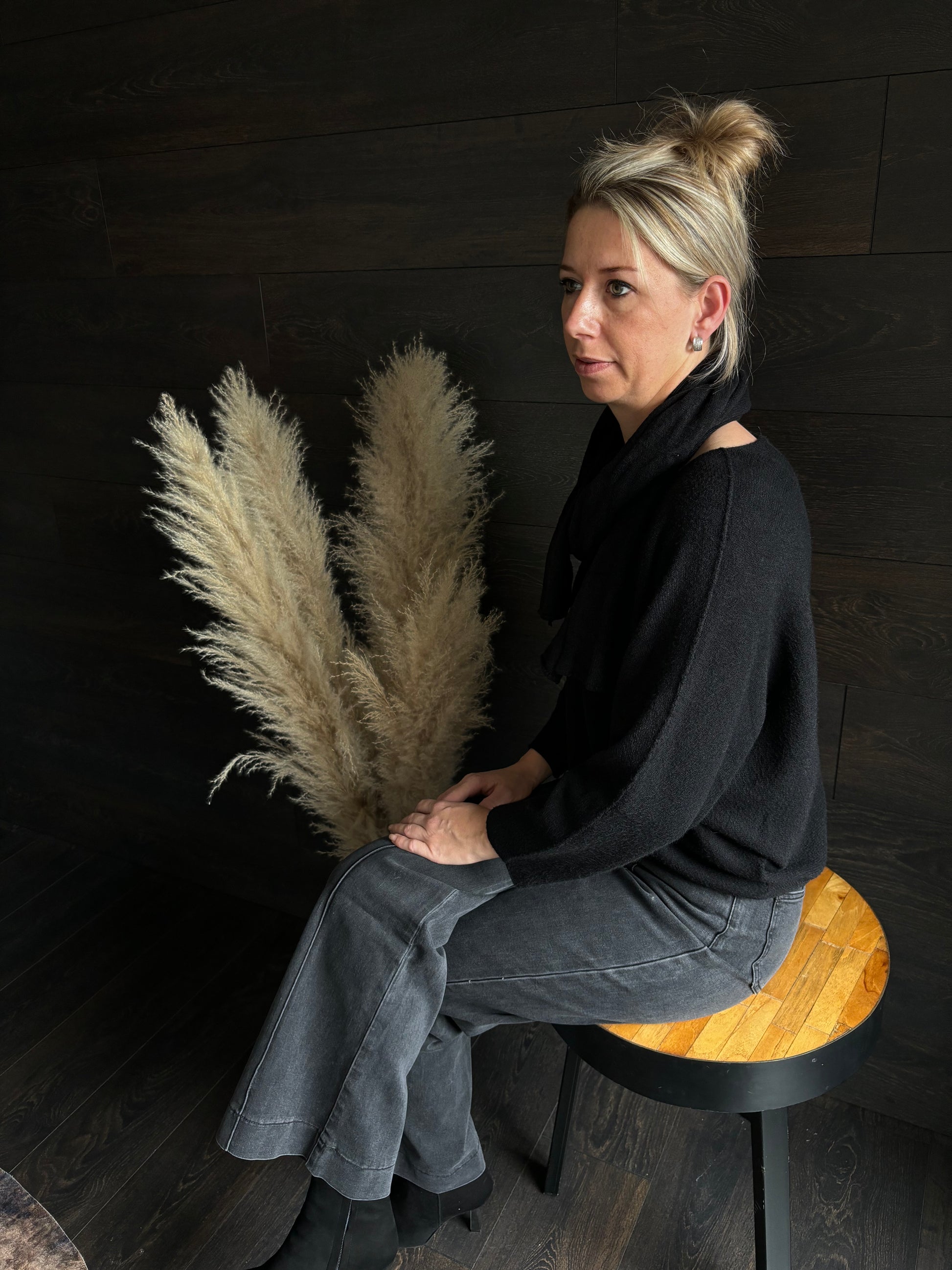 Deze pull heeft telkens een bijpassende sjaal, ik heb deze pull in diverse kleuren. Deze pull is TU kan zeker van maat XS tot maat L gedragen worden.