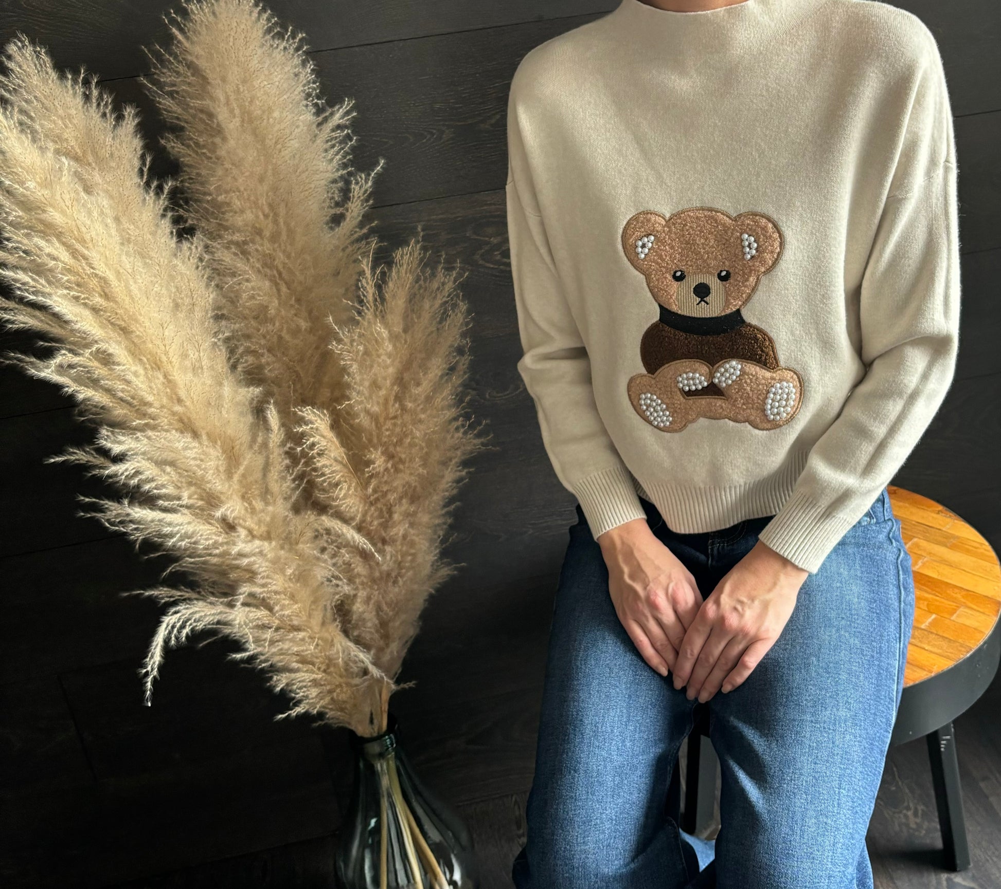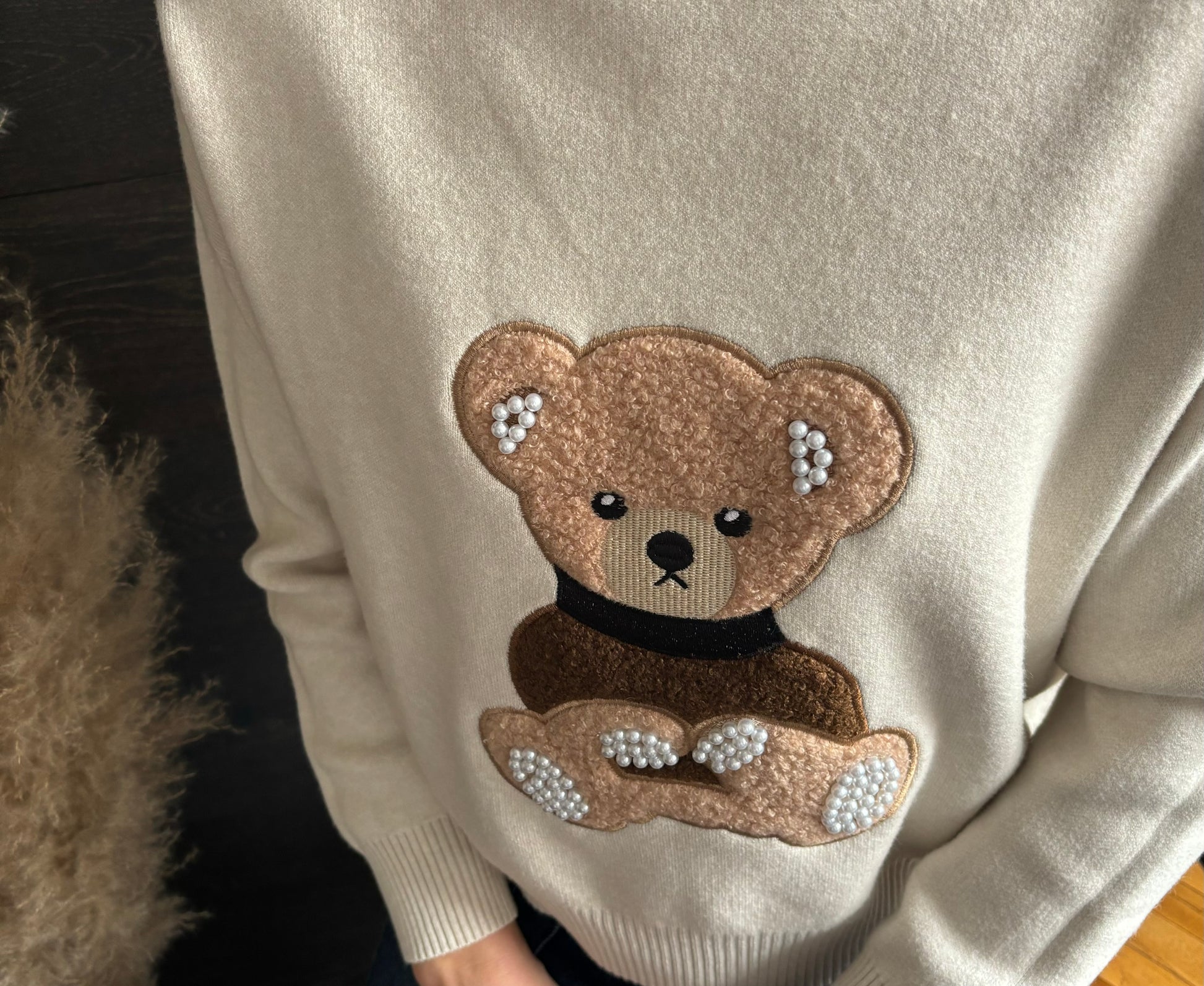 Deze super zachte trui met beer en parels is een echte eyecatcher. Ik heb deze enkel in ecru kleur is ook TU XS tot M zou ik aanraden van pasvorm. Alsook is deze geen lange trui en voor op een hoge taille van broek te combineren. Vervaardigd uit 47% viscose 28% polyester 25%polyamide.